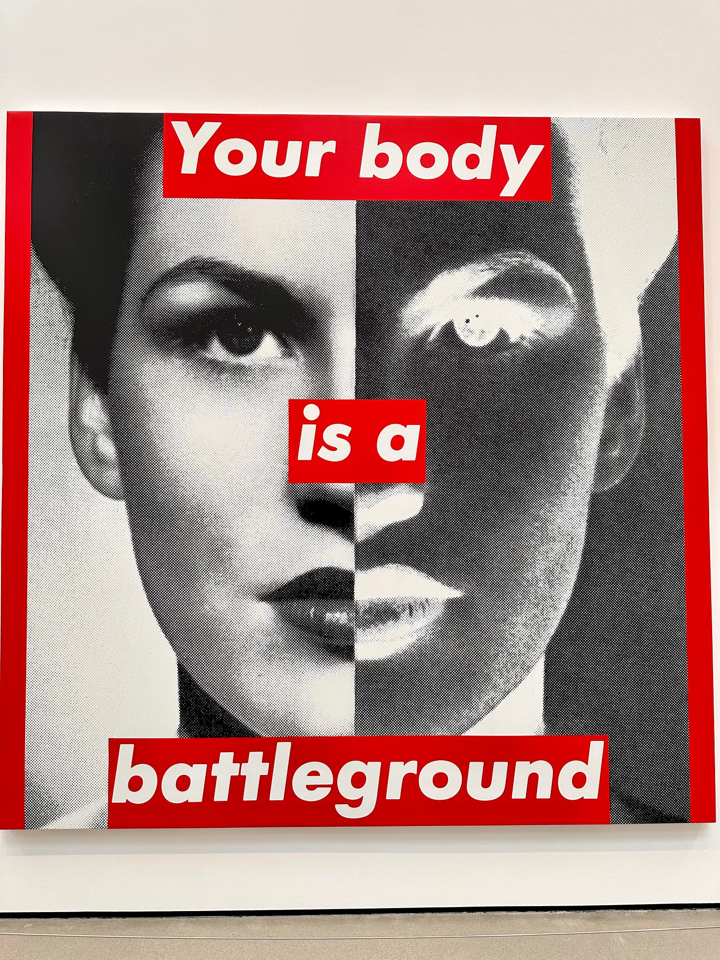 Eu recunosc că am recunoscut expresia nu din teatru, ci dinspre arte vizuale. Barbara Kruger este una dintre cele mai importante artiste feministe contemporane care a folosit exact ideea frazei „corpul femeii ca un câmp de luptă” într-o lucrare iconică din 1989 - Untitled (Your Body Is a Battleground) - pe care am văzut-o la Tate Modern sau The Broad (LA). Lucrarea a fost creată special ca poster pentru Marșul Femeilor de la Washington (9 aprilie 1989), în apărarea dreptului la avort (împotriva deciziilor care amenințau dezicia Roe v. Wade din 1973). A fost tipărită în mii de exemplare și lipită pe străzi și a devenit simbolul global al feminismului pro-choice. După răsturnarea Roe v. Wade în 2022, lucrarea a reapărut masiv la proteste. Barbara Kruger, care are acum 80 de ani, continuă să refolosească fraza în instalații mari, adaptând-o la crize actuale (războiul din Ucraina, restricții anti-avort, violență de gen).